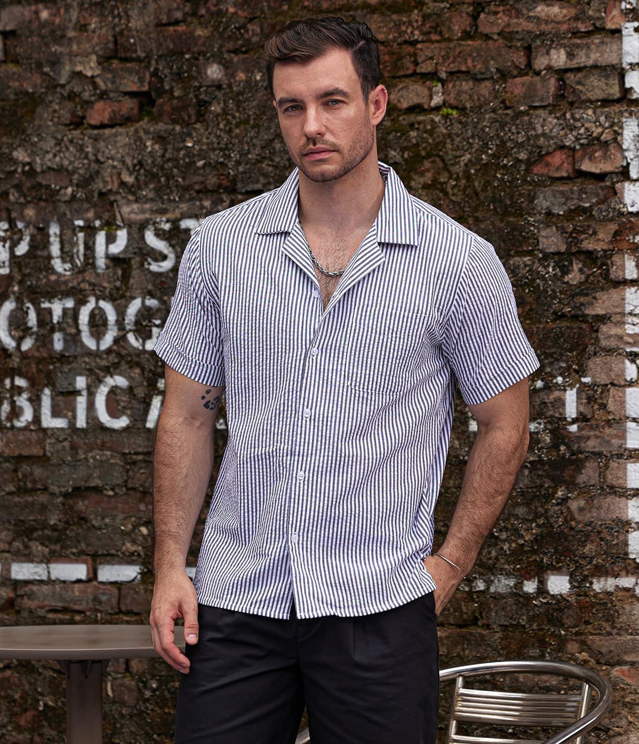VATPAVE Mens Striped Summer Shirt Casual Button Down Short Sleeve Beach Shirts Cotton Shirts for Men(Navy)