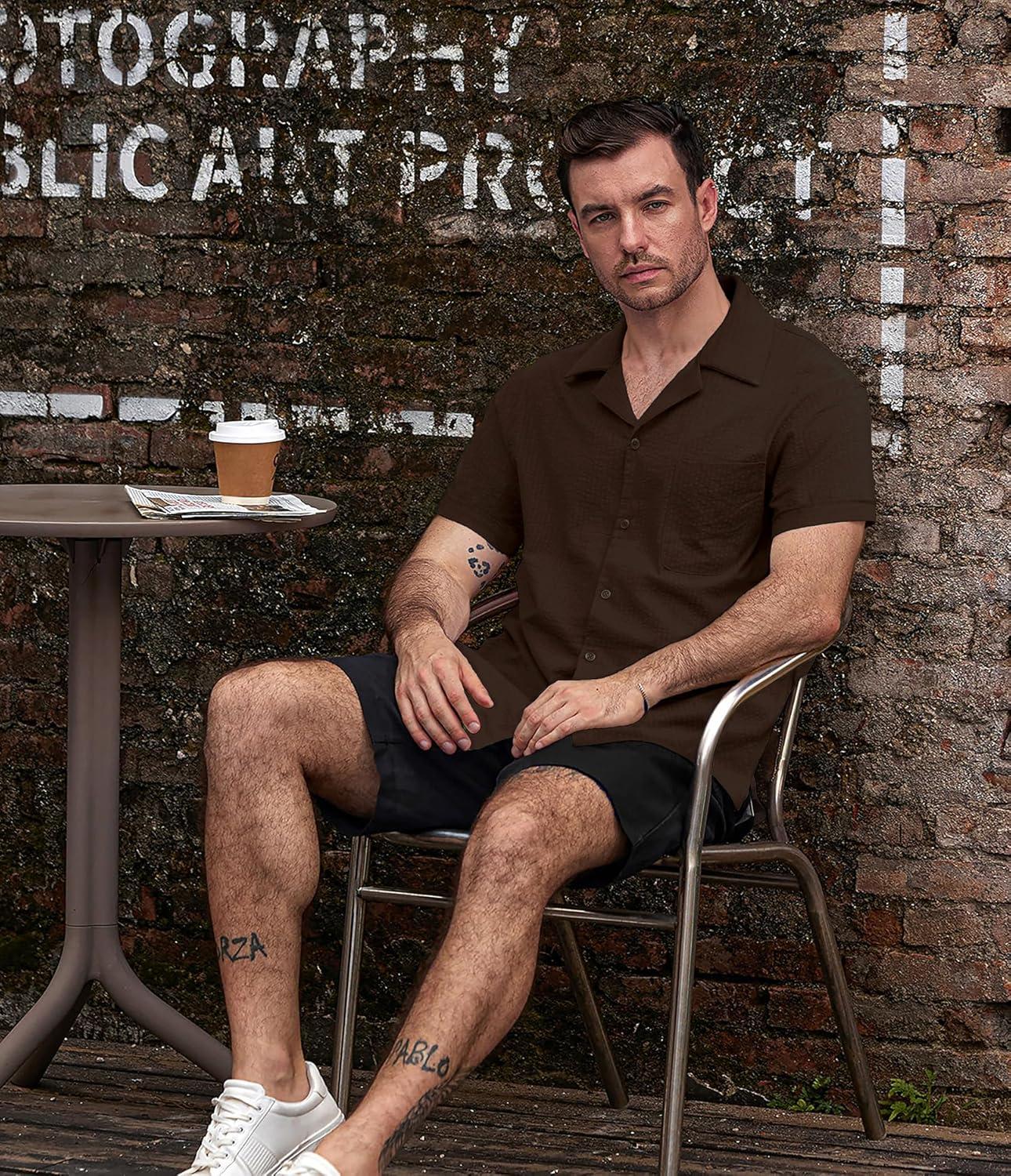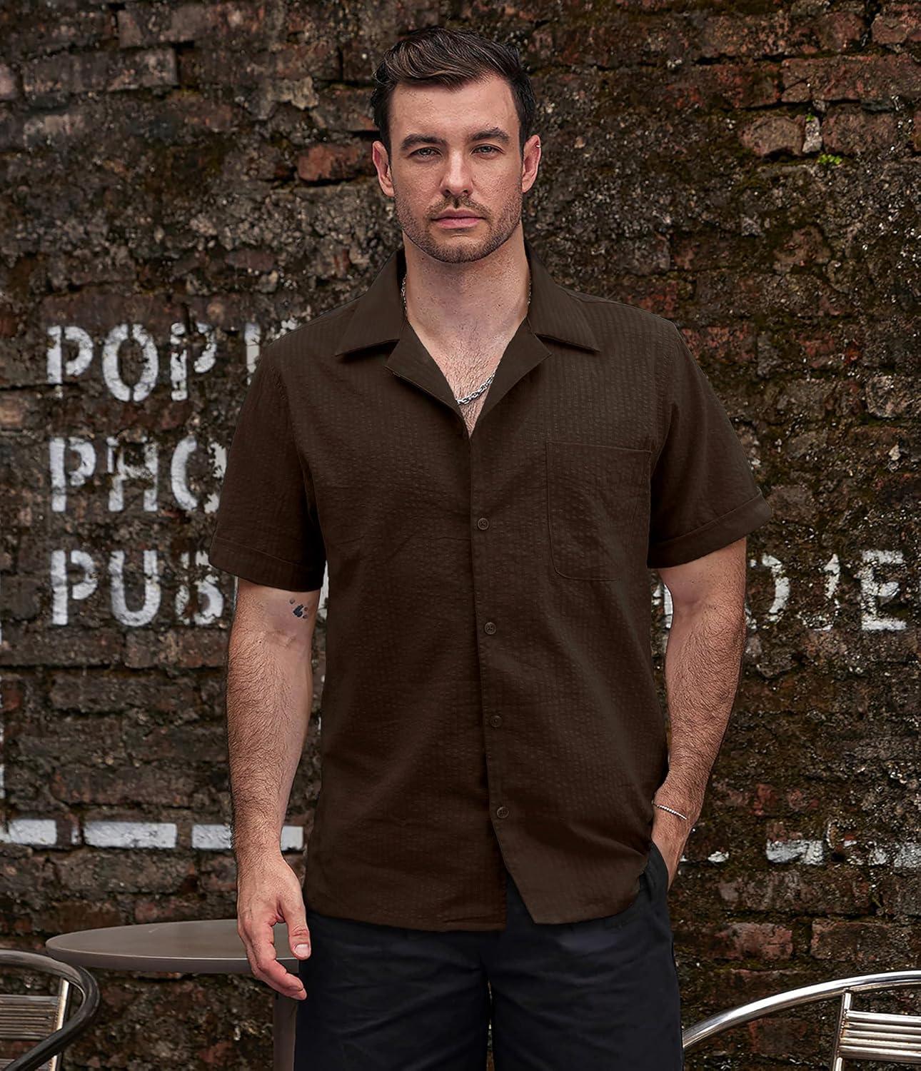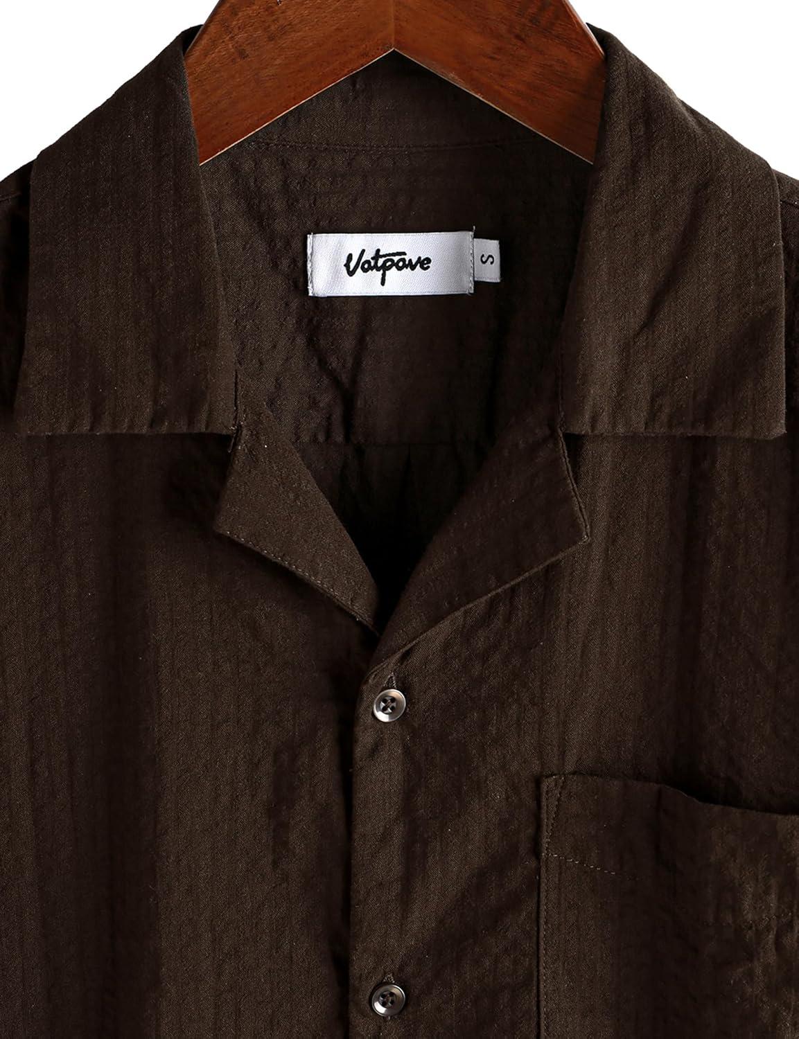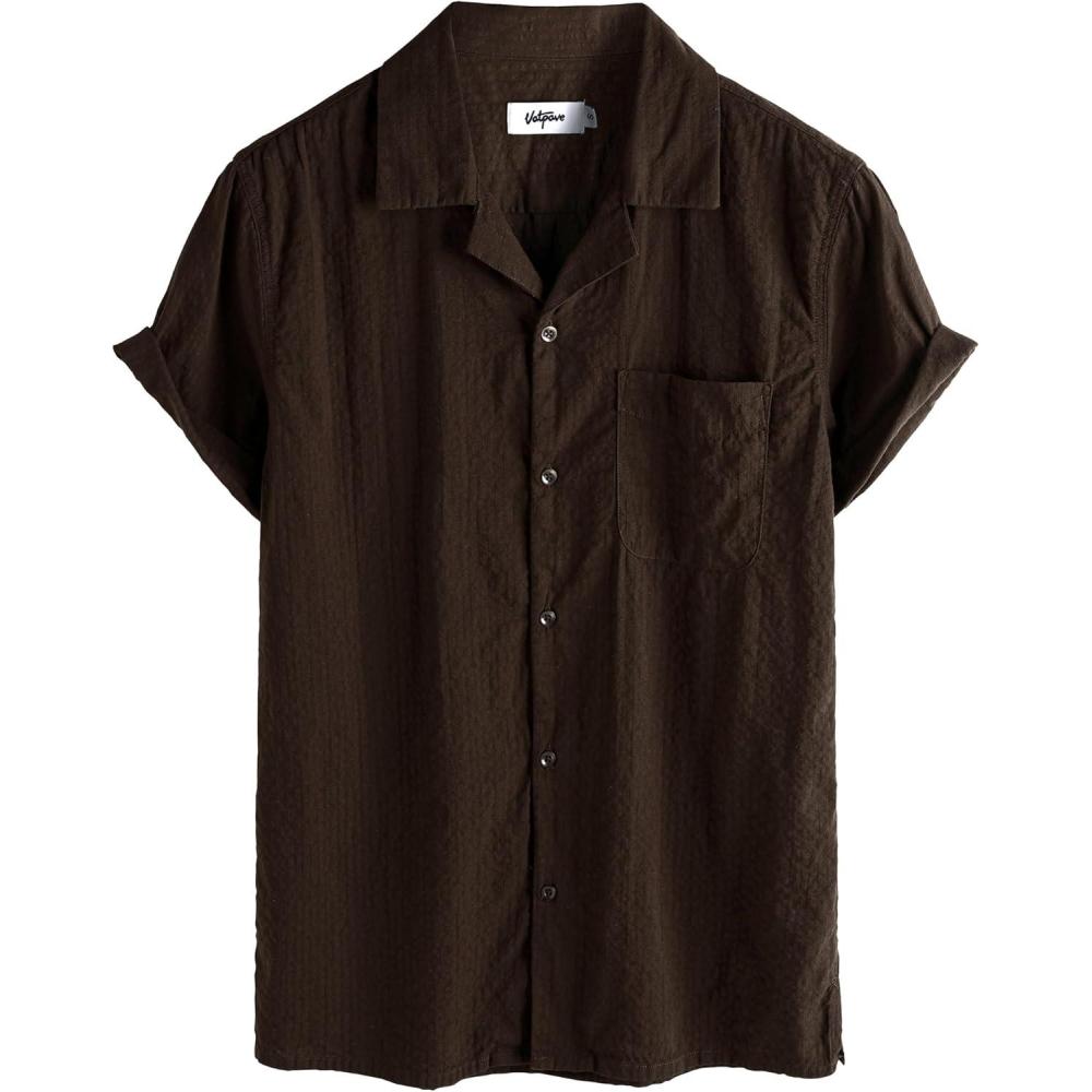VATPAVE Mens Striped Summer Shirt Casual Button Down Short Sleeve Beach Shirts Cotton Shirts for Men(Pure Coffee)