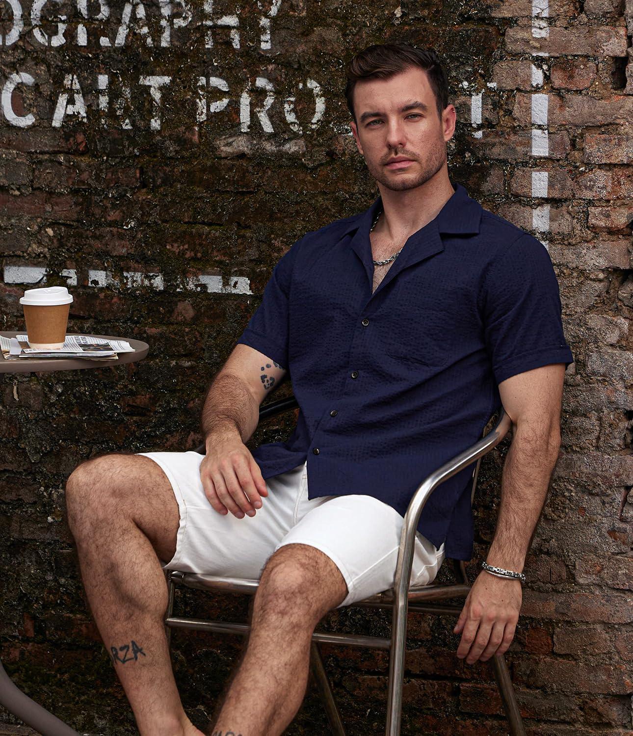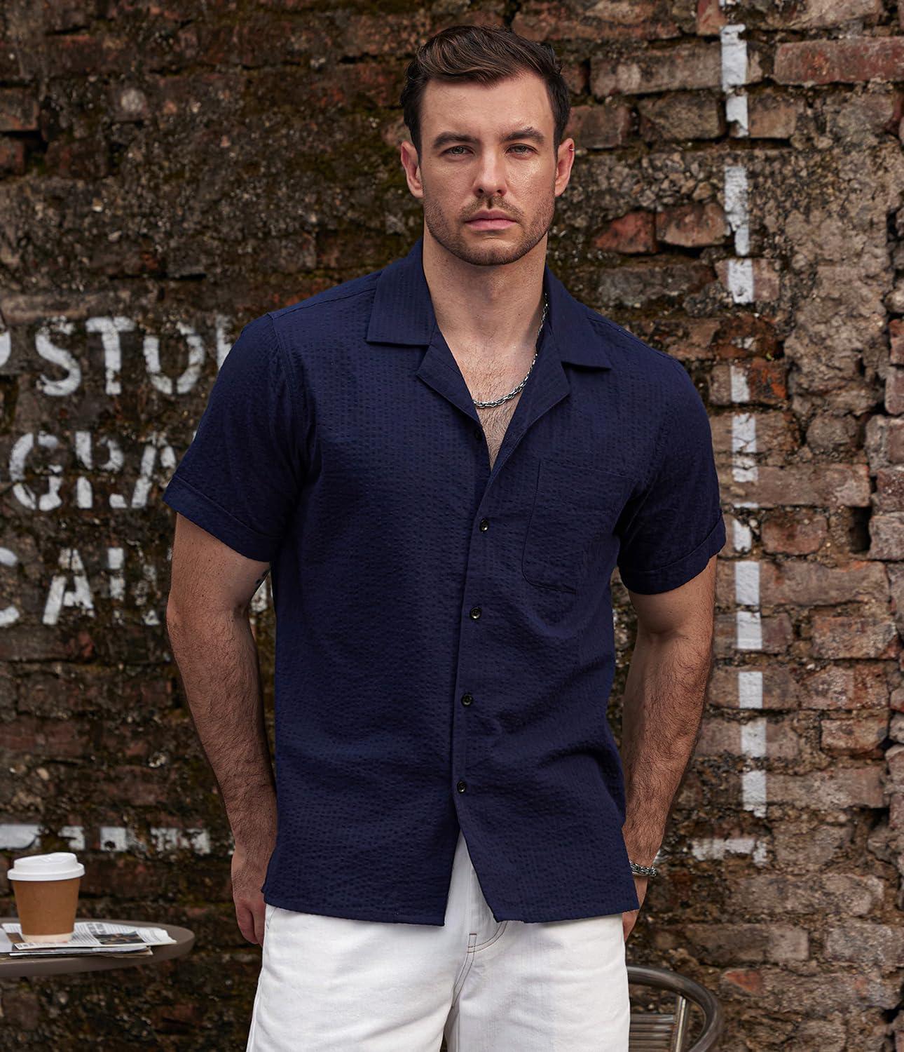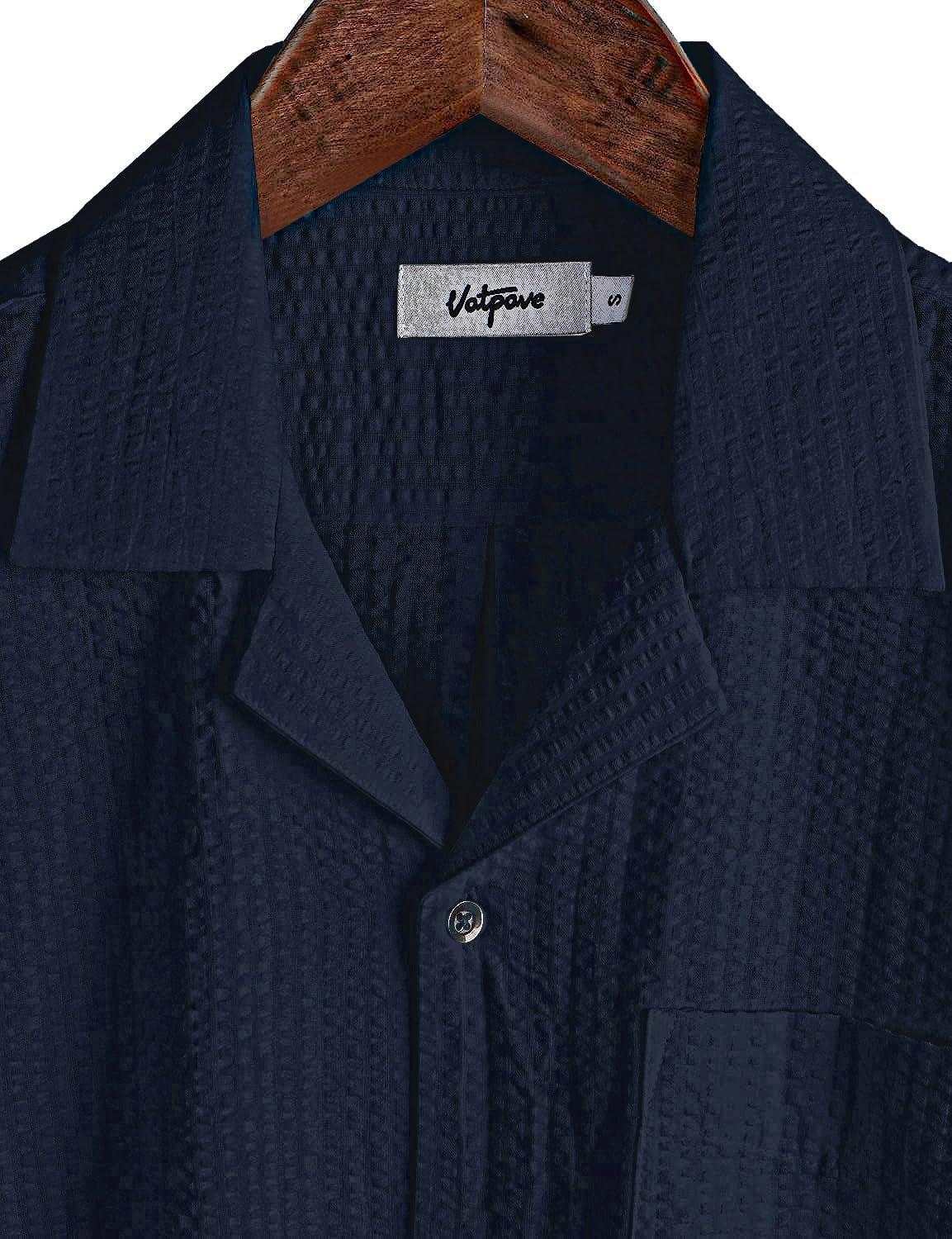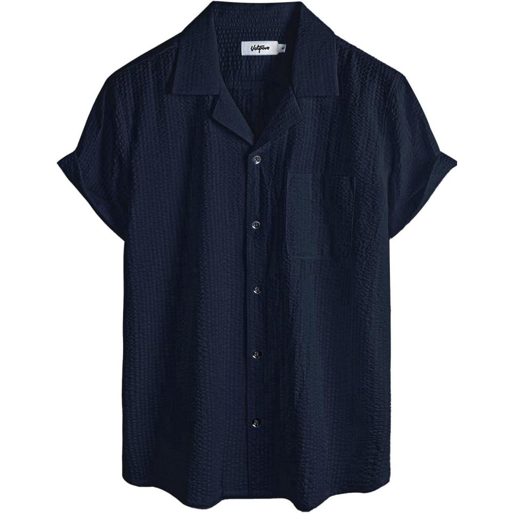 VATPAVE Mens Striped Summer Shirt Casual Button Down Short Sleeve Beach Shirts Cotton Shirts for Men(Pure Navy)