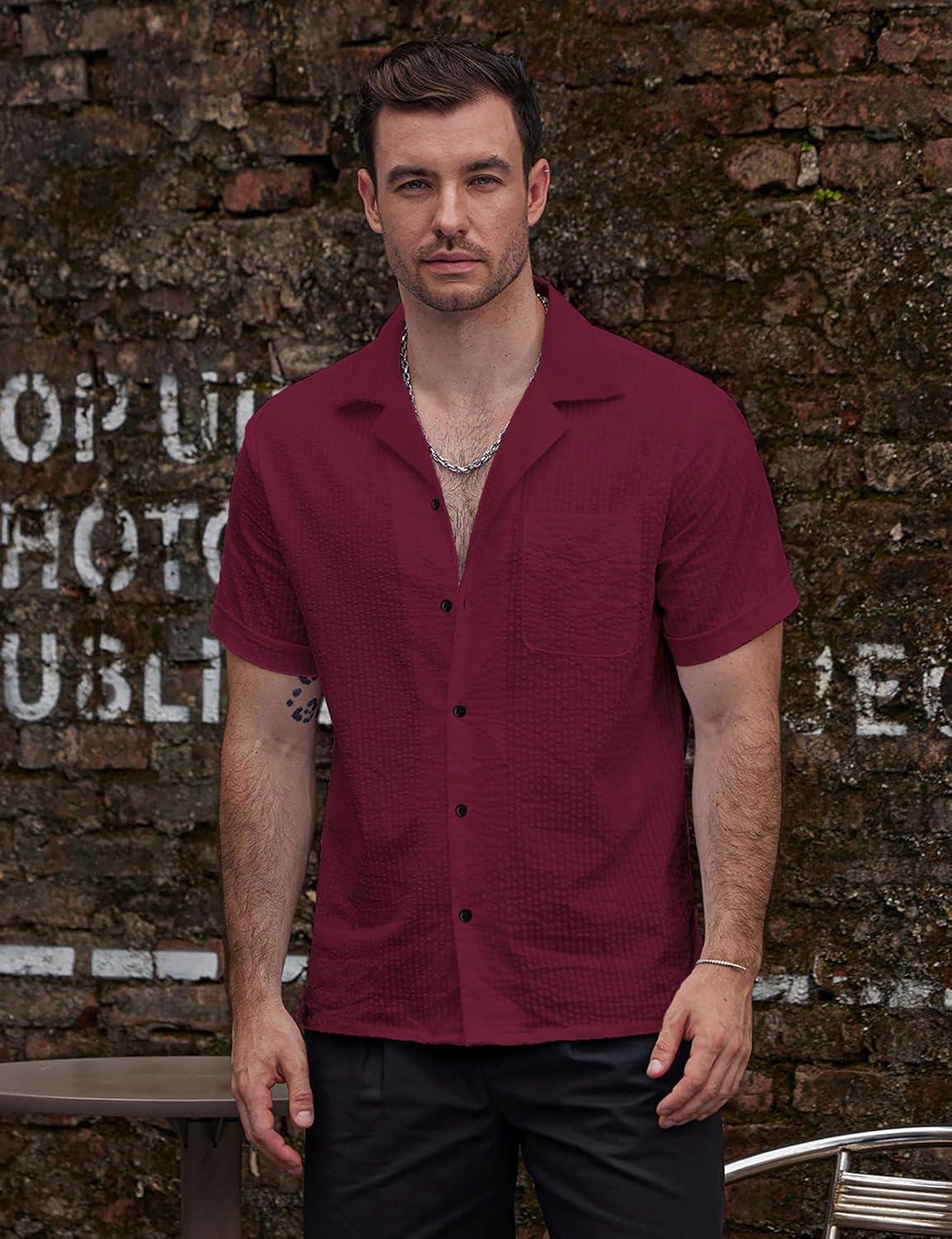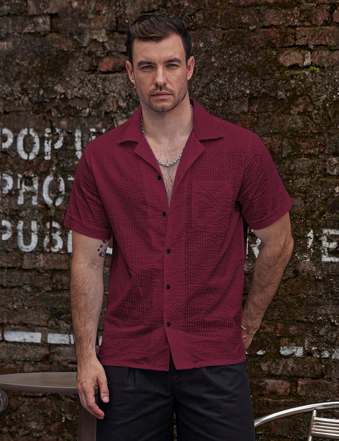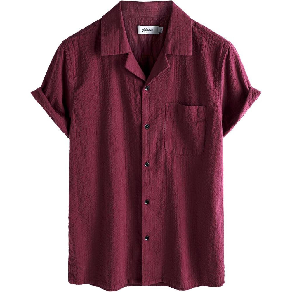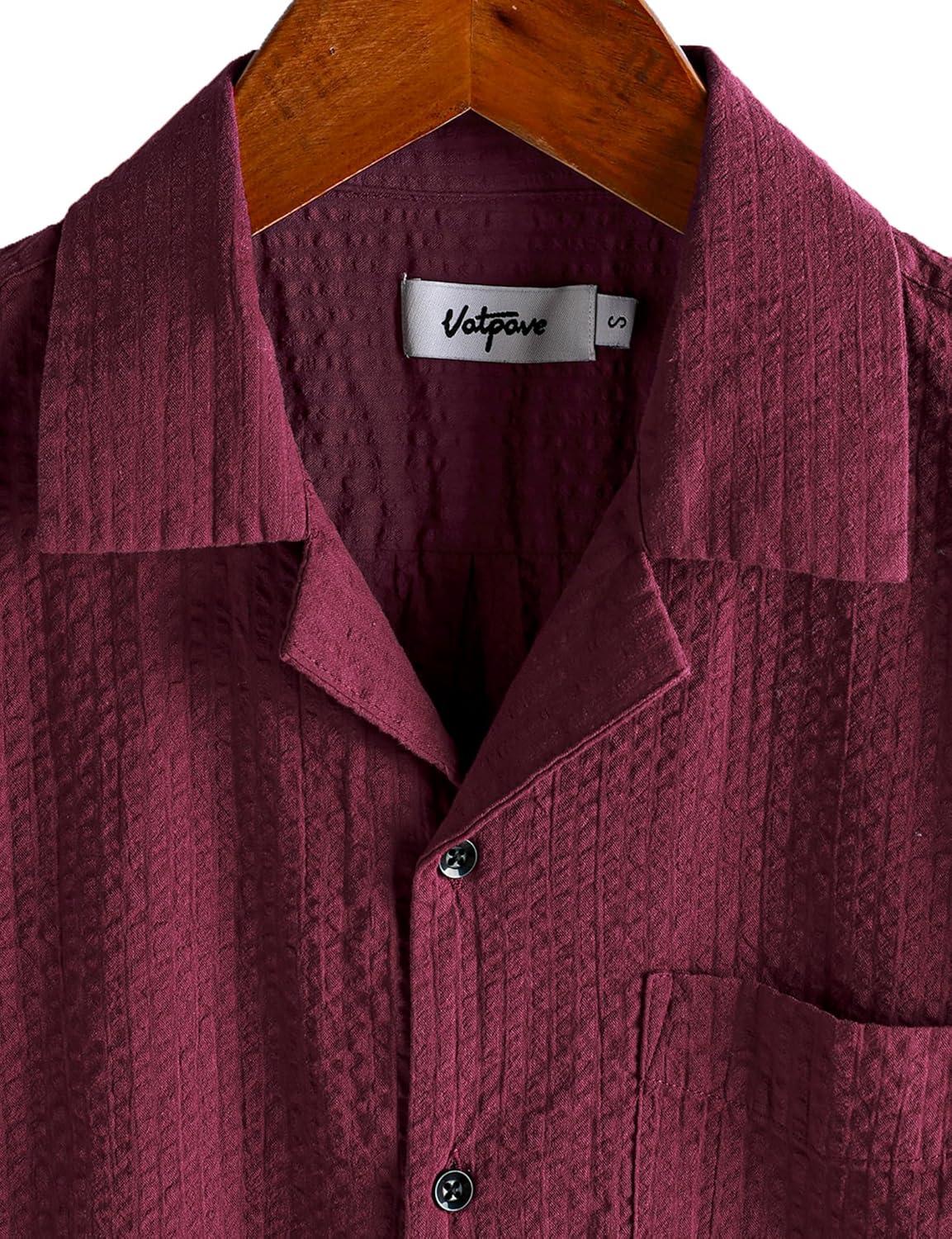 VATPAVE Mens Striped Summer Shirt Casual Button Down Short Sleeve Beach Shirts Cotton Shirts for Men(Pure Winered)
